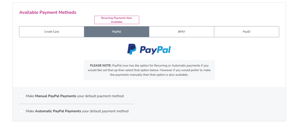 Currently, we offer the ability to set up automatic payments through Credit/Debit cards or PayPal. We are unable to process payments automatically through BPAY or PayID. If your default payment method is set to use any of these, you will need to manually pay your invoice.